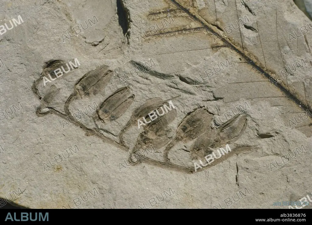 Fossil flowers of a plant from the heath and heather family (Ericaceae), found in the Clarkia Fossil Bowl, a Miocene Epoch lake bed deposit in northern Idaho. Some of the best fossil leaf preservation in the world is found here. This fossil is 3" long.