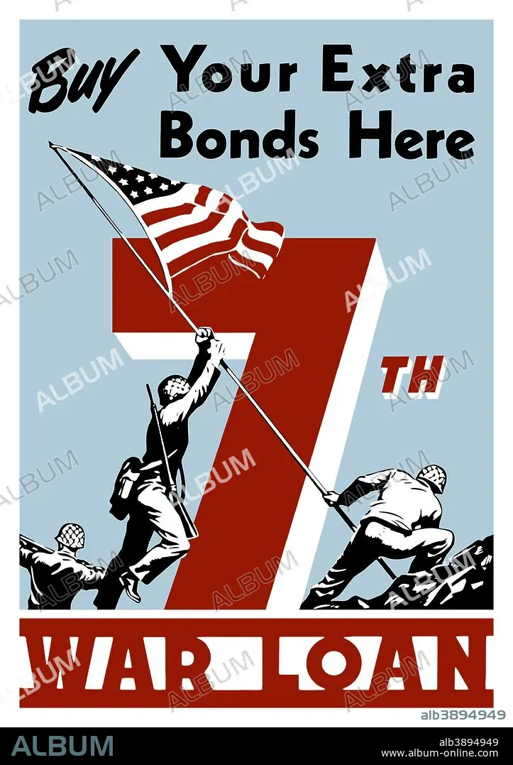 Vintage World War II propaganda poster featuring soldiers raising the American flag. It reads, Buy Your Extra Bonds Here, 7th War Loan.