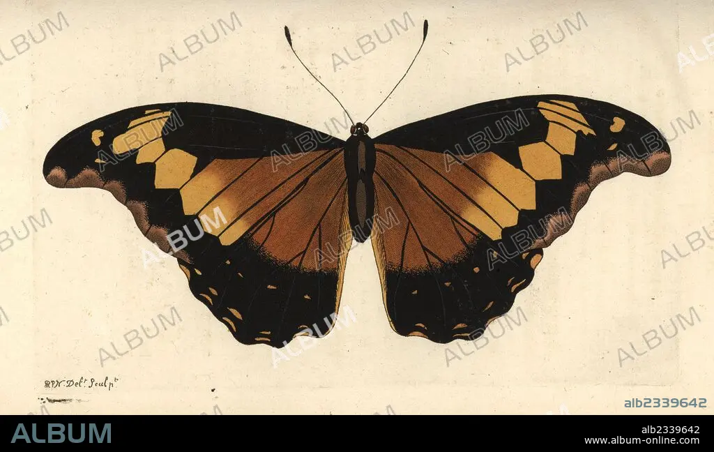 Caption: Rhetenor blue morpho, Morpho rhetenor (Andromachus butterfly, Papilio andromachus). Illustration drawn and engraved by Richard Polydore Nodder. Handcoloured copperplate engraving from George Shaw and Frederick Nodder's The Naturalist's Miscellany, London, 1804.