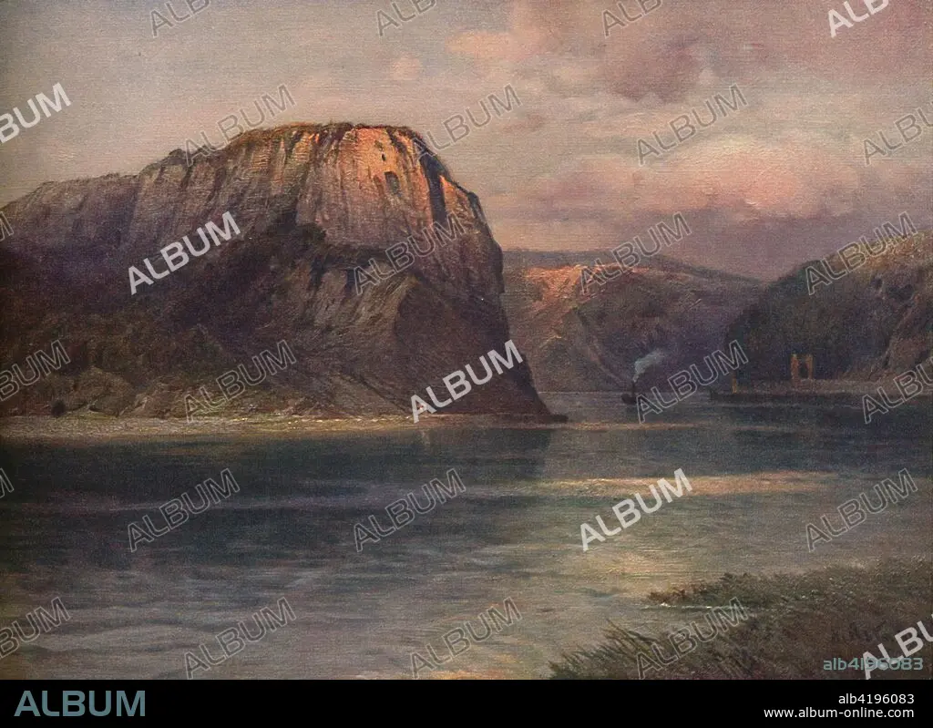 Caption: 'Die Loreley', (Lorelei), 1923. Lorelei is a steep slate rock on the right bank of the River Rhine in the Rhine Gorge (or Middle Rhine) at Sankt Goarshausen in Germany. From "Bilder vom Rhein", by Nikolai of Astudin. [Hoursch & Bechstedt., Köln, 1923]
