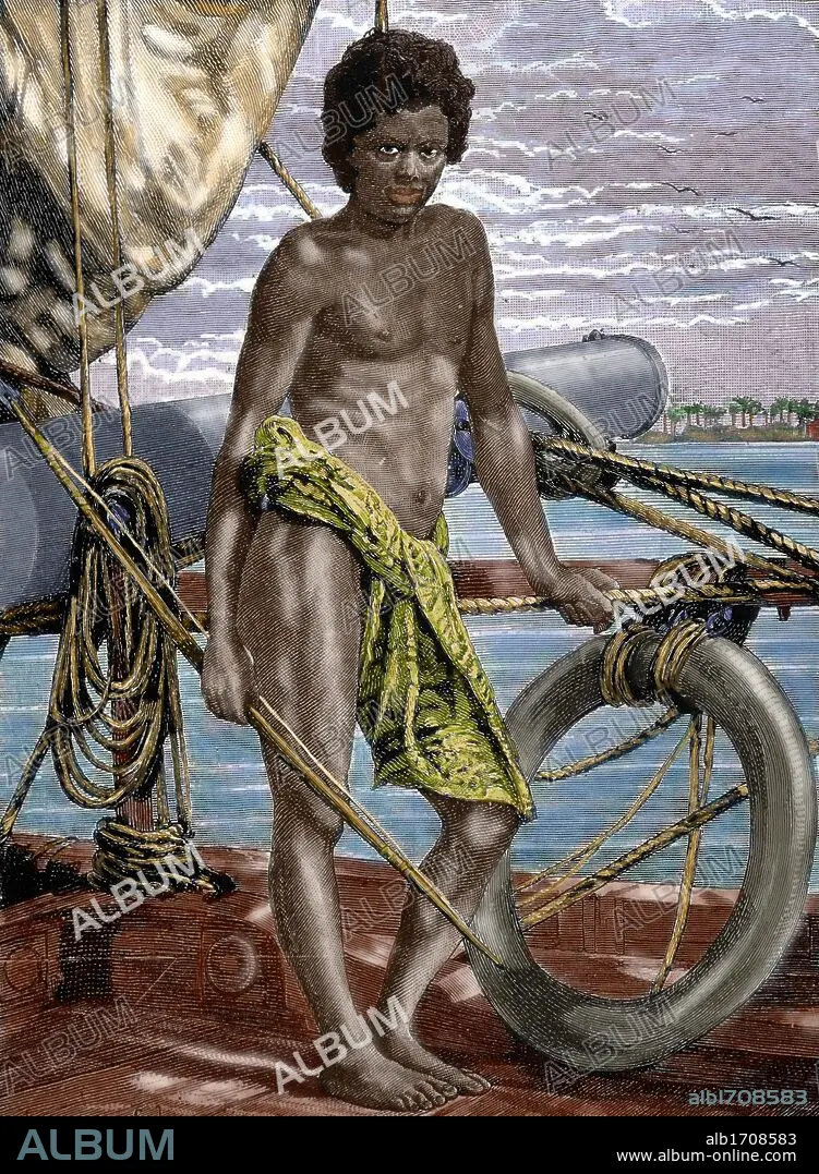 Oceania. Micronesia. Koror native (Palau Island) aboard an European ship. Colored engraving, 1882.