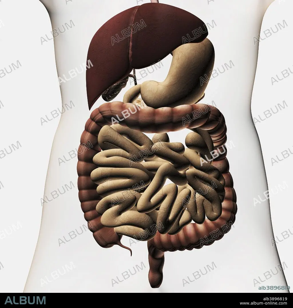 Medical illustration showing the human digestive system: liver, stomach, large intestine, small intestine.