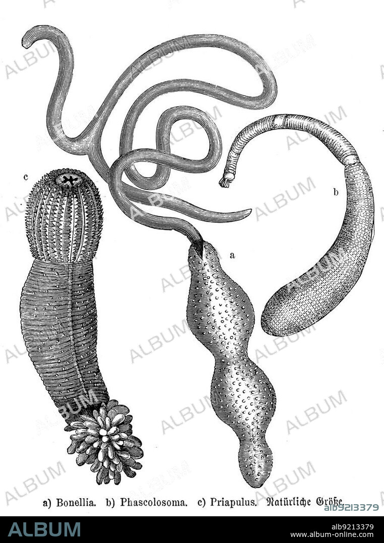 Caption: A. Bonellia, green hedgehog worm, Bonellia viridis, b. Phascolosoma, splash worm, c. Tailed priap worm or common priap worm, Priapulus caudatus, Historical, digitally restored reproduction from a 19th century original