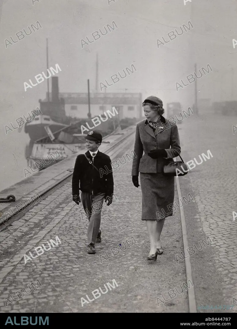 Kronprins Carl Gustaf vid en stilla morgonpromenad på Skeppsbron med Fröken Ingrid "Nenne" Björnberg på väg till Broms skola i Stockholm 1956. Foto: Text & Bilder / SVT / Kod: 5600.
