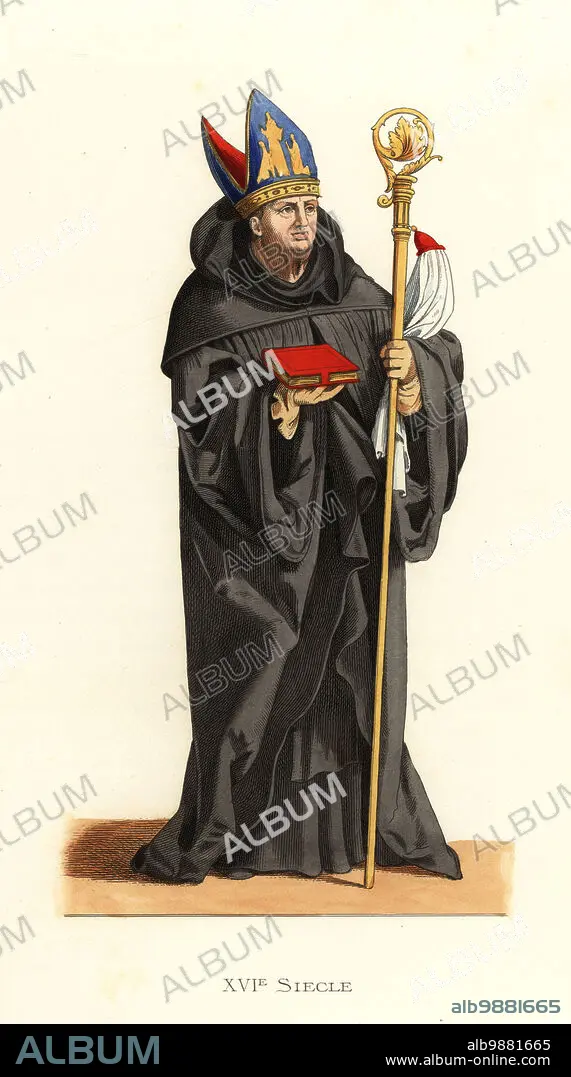 Caption: Benedictine abbot, Germany, 16th century. In black habit, carrying a bible and crozier, wearing an embroidered mitre. From a history of the Benedictines. Allemagne, Benedictin. Handcolored lithograph after an illustration by Edmond Lechevallier-Chevignard from Georges Duplessis's Costumes historiques des XVIe, XVIIe et XVIIIe siecles (Historical costumes of the 16th, 17th and 18th centuries), Paris, 1867. Edmond Lechevallier-Chevignard was an artist, book illustrator, and interior designer.