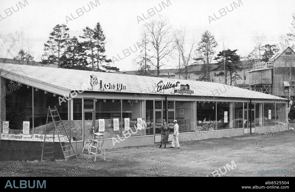 Stockholm 1956-04-17. Äntligen, säger husmödrarna i Hässelby gård som på torsdagen får ett litet butikscentrum vid Loviselundsvägen. Sedan i höstas har handlandet varit ett stort problem. Nu kommer på en gång två livsmedelsbutiker, en delikatess, en bosättningsaffär, en tobaksaffär och en damfrisering. Samtliga butiker har stor kapacitet och inredningarna är som vanligt nu för tiden ytterst eleganta. Musik och utdelning av reklamsaker i stora mängder ingår i invigningsprogrammet.. Foto: Tore Falk / Expressen / TT / Kod: 192. ** AFTONBLADET OUT **.