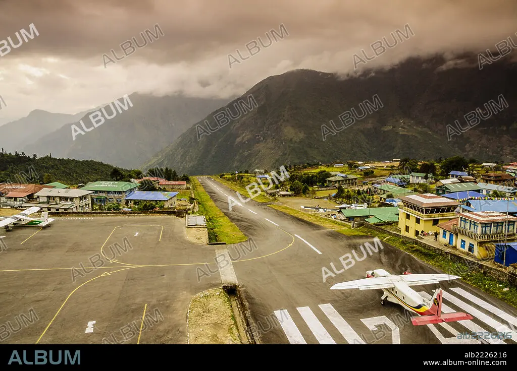 Plane about to take off between mountains, Lukla Airport, Sagarmatha National Park, Nepal, Asia.
