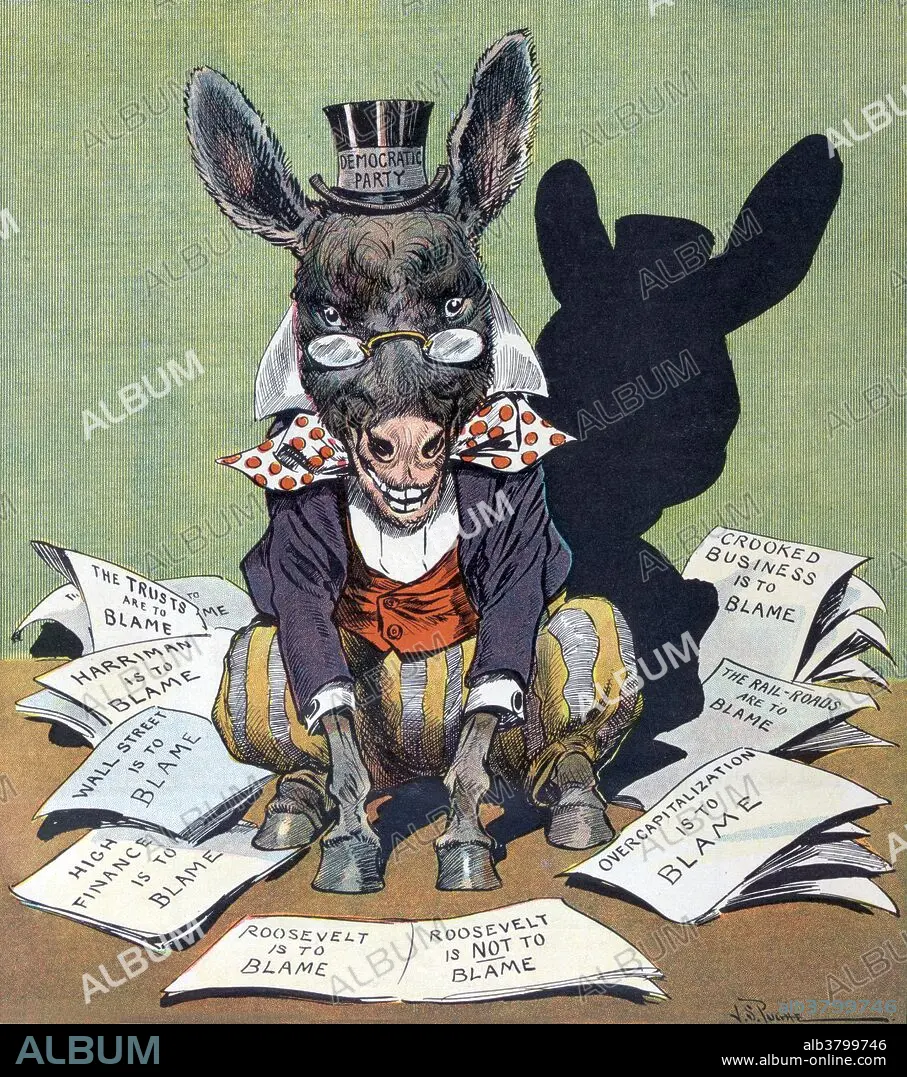 Entitled: "Well, for once they can't blame me". Puck Magazine cover art shows the Democratic donkey sitting among papers. Many are blamed, but no one will accept the responsibility for the Panic of 1907, a financial crisis that occurred in the United States when the NY Stock Exchange fell almost 50% from its peak the previous year. The panic was triggered by the failed attempt in October 1907 to corner the market on stock of the United Copper Company. When this bid failed, banks that had lent money to the cornering scheme suffered runs that later spread to affiliated banks and trusts, leading a week later to the downfall of the Knickerbocker Trust Company, NYC's third largest trust. The collapse of the Knickerbocker spread fear throughout the city's trusts as regional banks withdrew reserves from New York City banks. Panic extended across the nation as vast numbers of people withdrew deposits from their regional banks. At the time, the United States did not have a central bank to inject liquidity back into the market. Illustrated by John S. Pughe for Puck and published by Keppler & Schwarzmann, December 11, 1907.