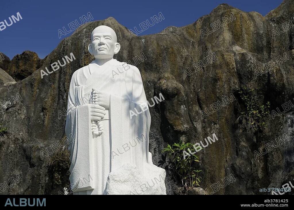 Caption: Buddha statue in front of rocks, landmark in Nha Trang, Vietnam, Southeast Asia, Asia