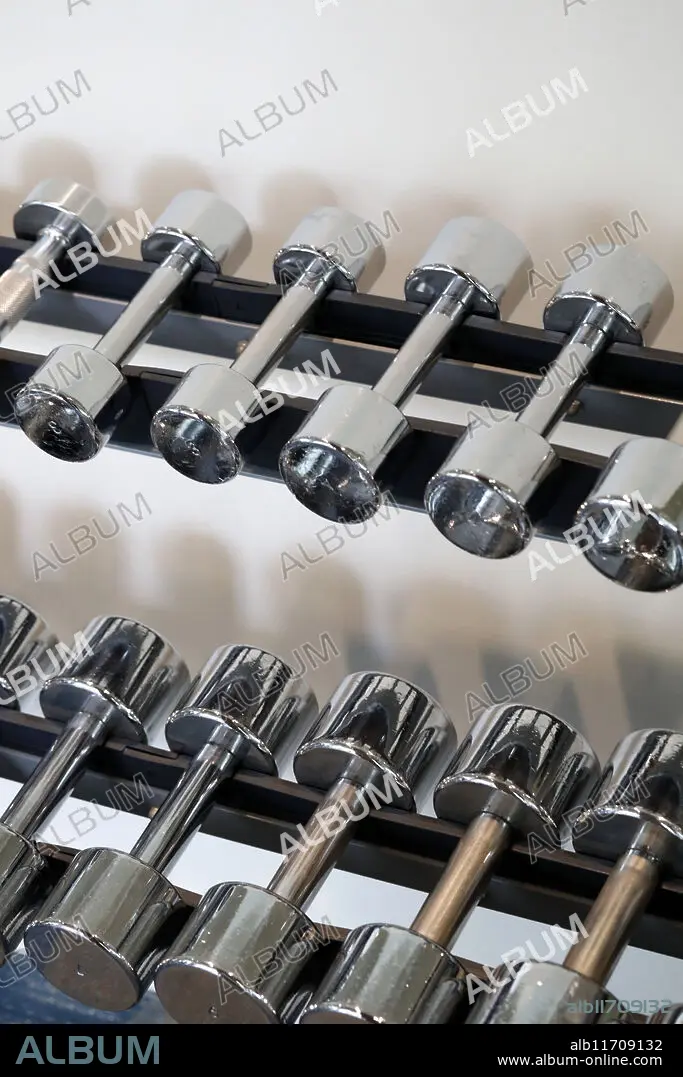 Caption: Row of dumbbells in sport club. Exercise in gym for healthy concept. Phu Quoc. Vietnam.