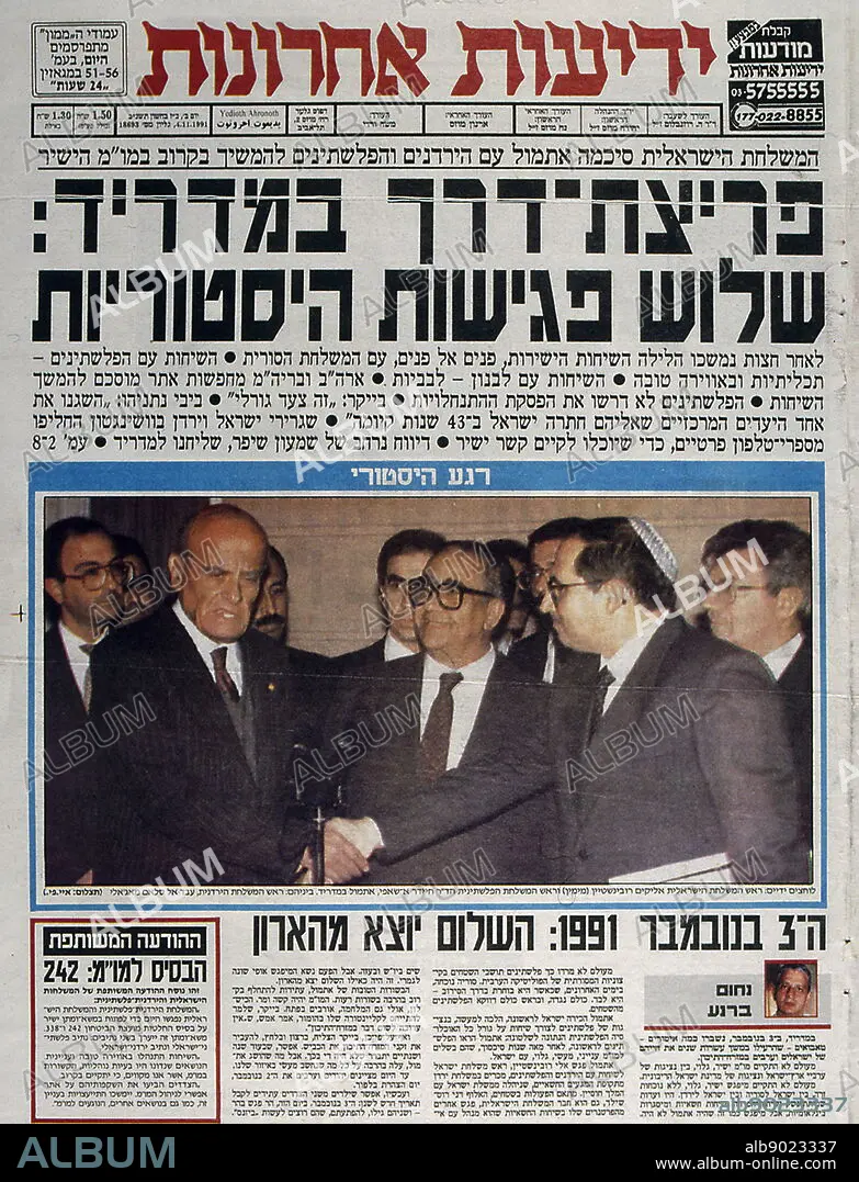 Caption: Photograph ofan Israeli newspaper printed in Hebrew. The Madrid Conference of 1991 was a peace conference, held from 30 October to 1 November 1991 in Madrid, hosted by Spain and co-sponsored by the United States and the Soviet Union. It was an attempt by the international community to revive the Israeli-Palestinian peace process through negotiations. On 3 November, the conference was followed by bilateral negotiations between Israel and respectively the joint Jordanian-Palestinian delegation, Lebanon and Syria.