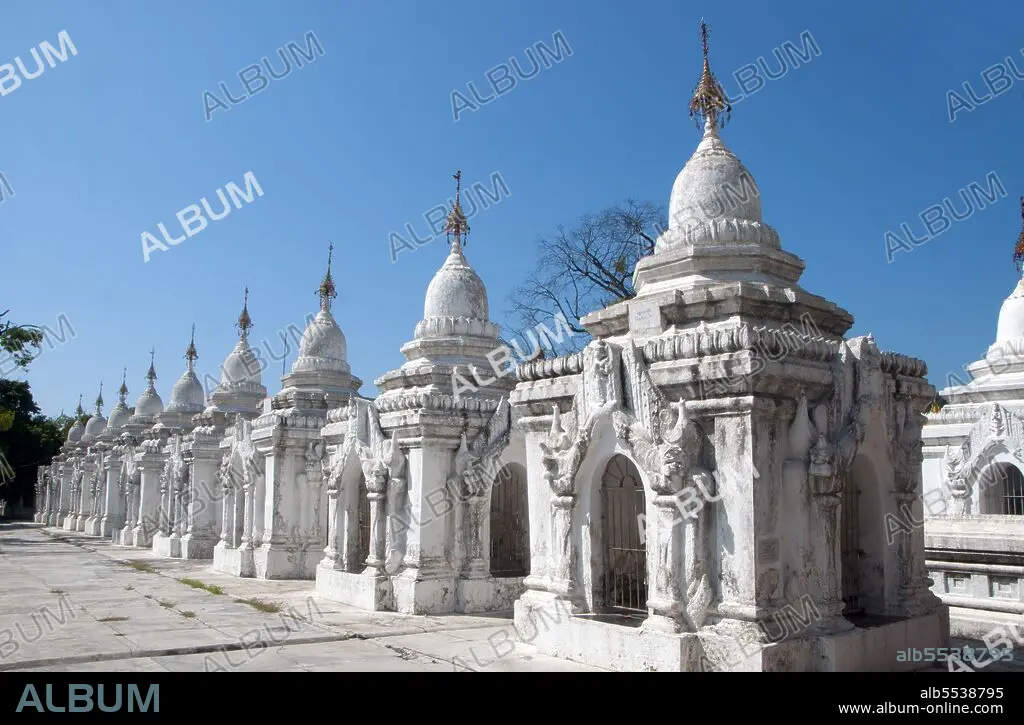 Caption: The entire Tipitaka Pali canon of Theravada Buddhism is set on 729 marble slabs, each with 80 to 100 lines of text, originally in gold ink, on both the obverse and the reverse sides. Each stone is three and a half feet wide, five feet tall and five inches thick and housed in a kyauksa gu or a small cave-like stupa. Kuthodaw Pagoda, literally meaning Royal Merit Pagoda, and formally titled Mahalawka Marazein, is a Buddhist temple and stupa located in Mandalay, central Burma. It lies at the foot of Mandalay Hill and was built during the reign of King Mindon (1808—78). The stupa itself, which is gilded above its terraces, is 57 m (188 ft) high, and is modelled after the Shwezigon Pagoda at Nyaung-U near Bagan. In the grounds of the pagoda are 729 'kyauksa gu' or stone-inscription caves, each containing a marble slab inscribed on both sides with a page of text from the Tipitaka, the entire Pali Canon of Theravada Buddhism. The stone inscriptions are considered to be the largest book in the world. Mandalay, a sprawling city of more than 1 million people, was founded in 1857 by King Mindon to coincide with an ancient Buddhist prophecy. It was believed that Gautama Buddha visited the sacred mount of Mandalay Hill with his disciple Ananda, and proclaimed that on the 2,400th anniversary of his death, a metropolis of Buddhist teaching would be founded at the foot of the hill.