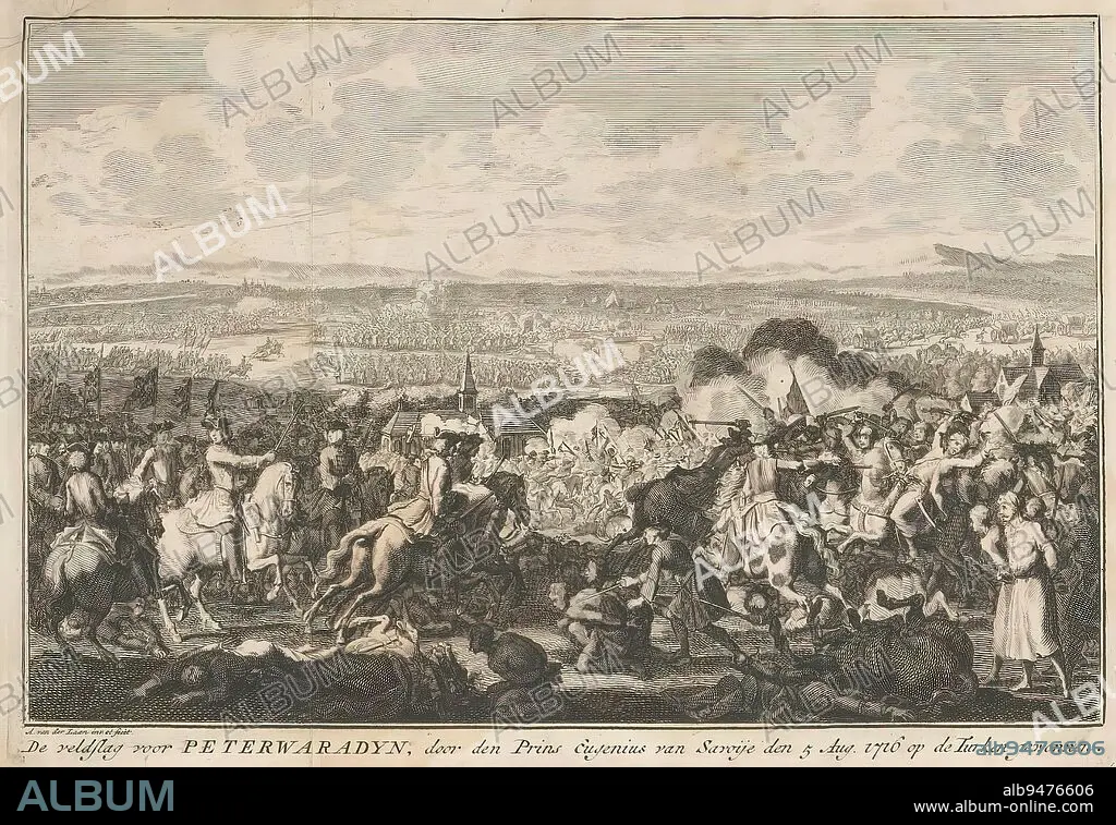 Caption: Battle of Petrovaradin, 1716, The battle for Peterwaradyn, won by den Prins Eugenius of Savoy den 5 Aug. 1716 on the Turks (title on object), The battle of Petrovaradin (present-day Novi Sad in Serbia) on the Danube with a victory of the imperial troops under the Prince of Savoy over the Turks, 5 August 1716. On a top sheet together with the portrait of Eugenius of Savoy., print maker: Adolf van der Laan, after own design by: Adolf van der Laan, (mentioned on object), Netherlands, 1716, paper, etching, engraving, height 153 mm × width 228 mm