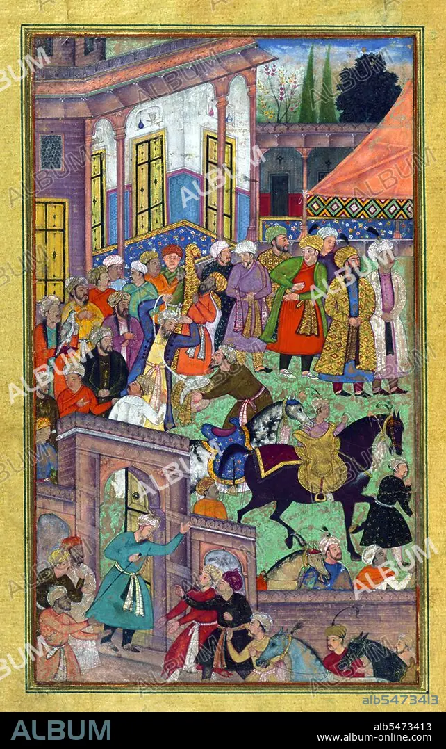 Title: India: Scene from the Baburnama. Zahir ud-din Muhammad Babur (1483-1531) the first Mughal Emperor, donning a turban before mounting his horse