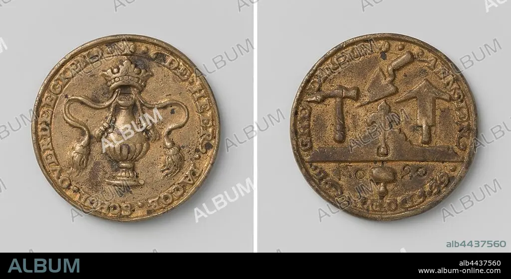 Masonry Guild of Vlissingen, Guild Medal with No. 20, Brass Medal. Front: crowned bottle, on crown: ribbons within the circumference. Reverse: hammer, trowel and plumber's hammer above spirit level and inscription No. 20, interrupted by mason's hammer, Flushing, Jacob Schot, Johannes Looff, 1639, brass (alloy), engraving, d 4.2 cm × w 313 gr