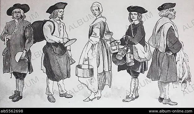 Mode, Kleidung in Frankreich, Rokoko, Pariser Straßenleben um 1740, von links, ein Schornsteinfeger, ein auvergnatischer Kupferschmied und Kesselflicker, ein Hausierer mit frischen Walnüssen, ein Händler mit Handlaternen und ein Händler mit Kaninchenfellen, digital restaurierte Reproduktion einer Originalvorlage aus dem 19. Jahrhundert, genaues Originaldatum nicht bekannt