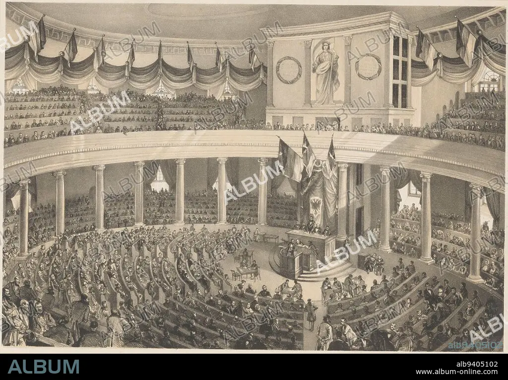 Frankfurt National Assembly, 1848-1849, Eduard Gustav May, after Friedrich Bamberger, 1848 - 1849, Frankfurt National Assembly (or Frankfurter Parliament), meeting of the first elected German parliament, in the Pauluskirche in Frankfurt am Main, 1848-1849., print maker: Eduard Gustav May, (mentioned on object), intermediary draughtsman: Friedrich Bamberger, (mentioned on object), printer: Eduard Gustav May, (mentioned on object), Frankfurt am Main, 1848 - 1849, paper, h 358 mm × w 540 mm