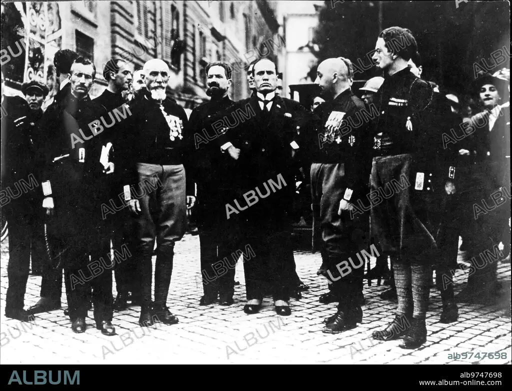 Rome. 10/28/1922. March on Rome: Benito Mussolini, Michele Bianchi (1st from the left), Italo Balbo (1st from the right) and Cesare María de Vecchi (2nd from the right) in the Piazza del Pópolo after their arrival in the Italian capital in front of 40,000 black shirts