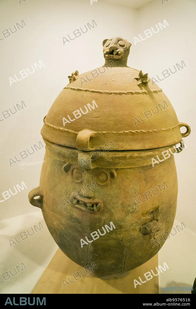 Caption: urna funeraria con la imagen del dios solar y el jaguar, clásico, Santa María Nebaj,museo de antropologia Maya, departamento de El Quiché, Guatemala, Central America