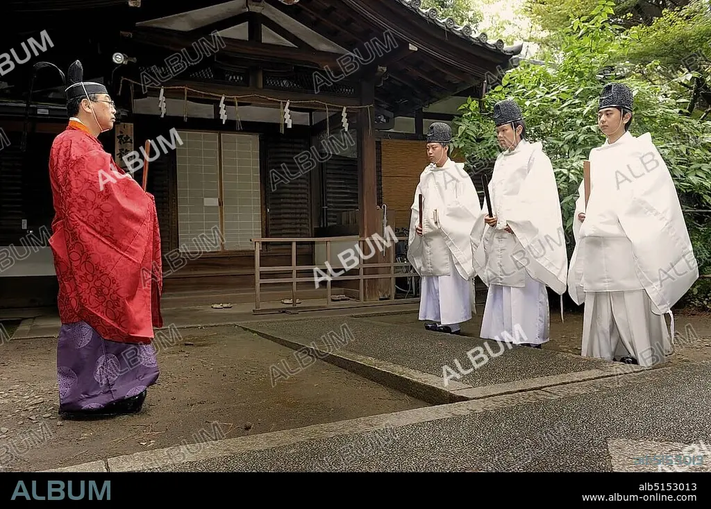Caption: Shinto priests carrying scepters and wearing hats, Nashinoki Shrine, Kyoto, Japan, East Asia, Asia