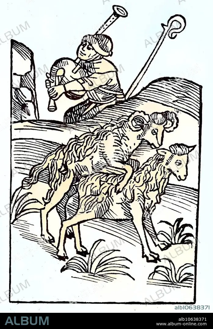 Caption: Digitally restored, Paarung von Widder und Schaf, Holzschnitt, Veröffentlichung aus dem Jahr 1882, Digitally improved:, Mating or mateing of Aries and sheep, woodcut, publication from the year 1882