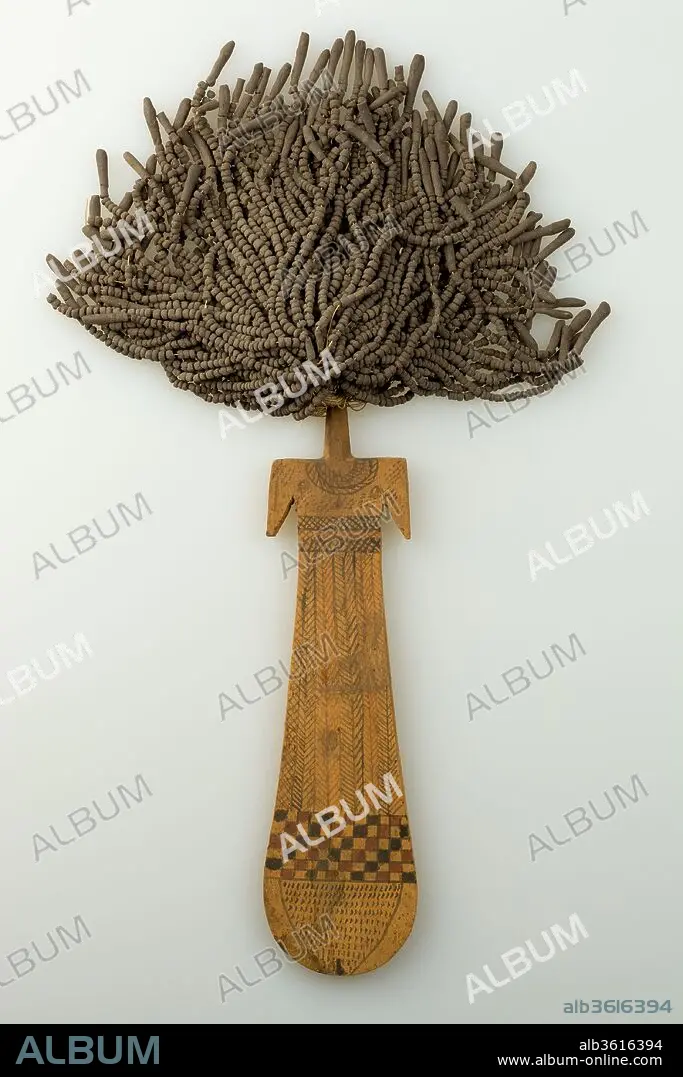 The so-called paddle doll consists of a flat piece of wood depicting the torso, rudimentary arms and neck of a woman, with a thick shock of "hair" made of beads strung on linen thread. The body is often painted with jewelry, textile patterns and/or tattoos. Contrary to their modern name, these "dolls" were not toys. The key-hole shape of the body is similar to the counterpoise of the menat necklaces that were used as percussion instruments during religious ceremonies (see 11.215.450) . When shaken, the beads of the menat necklace would have made a sound intended to appease a god or goddess. The paddle dolls, with their beaded hair, may have served the same purpose. It has been suggested that paddle dolls were an accoutrement of troops of singers and dancers who performed at religious ceremonies associated with the goddess Hathor.