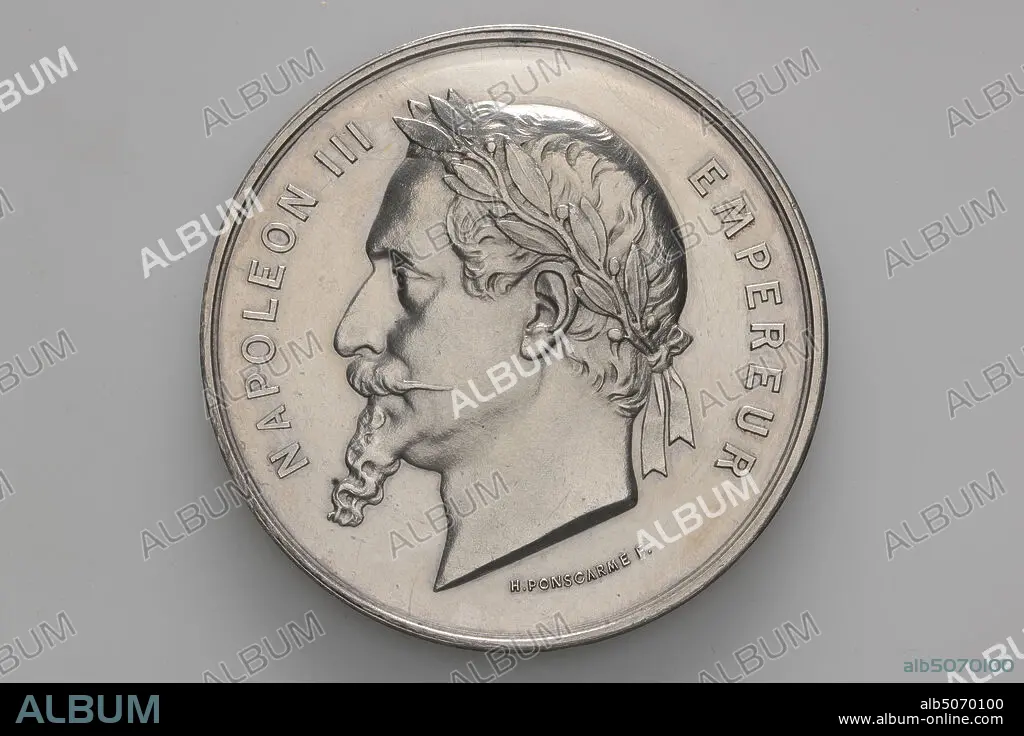 prize medal, Hubert Ponscarme, 1867, minted, General: 5 x 0.4cm (50 x 4mm), Weight: 65.3g, man's portrait, Silver prize medal at the World Exhibition in Paris in 1867 for the company J. Scheltema Jzn. On the front is a left-facing portrait of Emperor Napoleon III with mustache and chin beard and on the head a laurel wreath. Around the portrait the circular: NAPOLEON III EMPEREUR. Below the neck in very small letters the name of the maker: H. PONSCARME F .. On the back outside a double circle with a pearl edge the circular: EXPOSITION UNIVERSELLE DE MDCCCLXVII A PARIS RECOMPENSÉ S. In the middle the inscription: J. SCHELTEMA FILS, 2000
