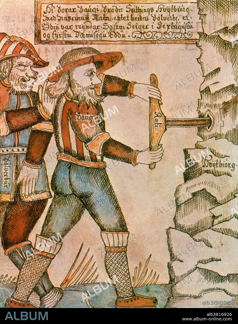 Caption: According to Norse mythology, Odin, disguised as a farmhand named Bolverk, gave the drill called Rati to Baugi, the farmer, to drill a hole in the mountain where the Poetic Mead was hidden. Odin then became a snake, slipped inside the hole, and stole the mead, which he eventually dispensed among the gods and men gifted in poetry. Illustration from an 18th century Icelandic manuscript.
