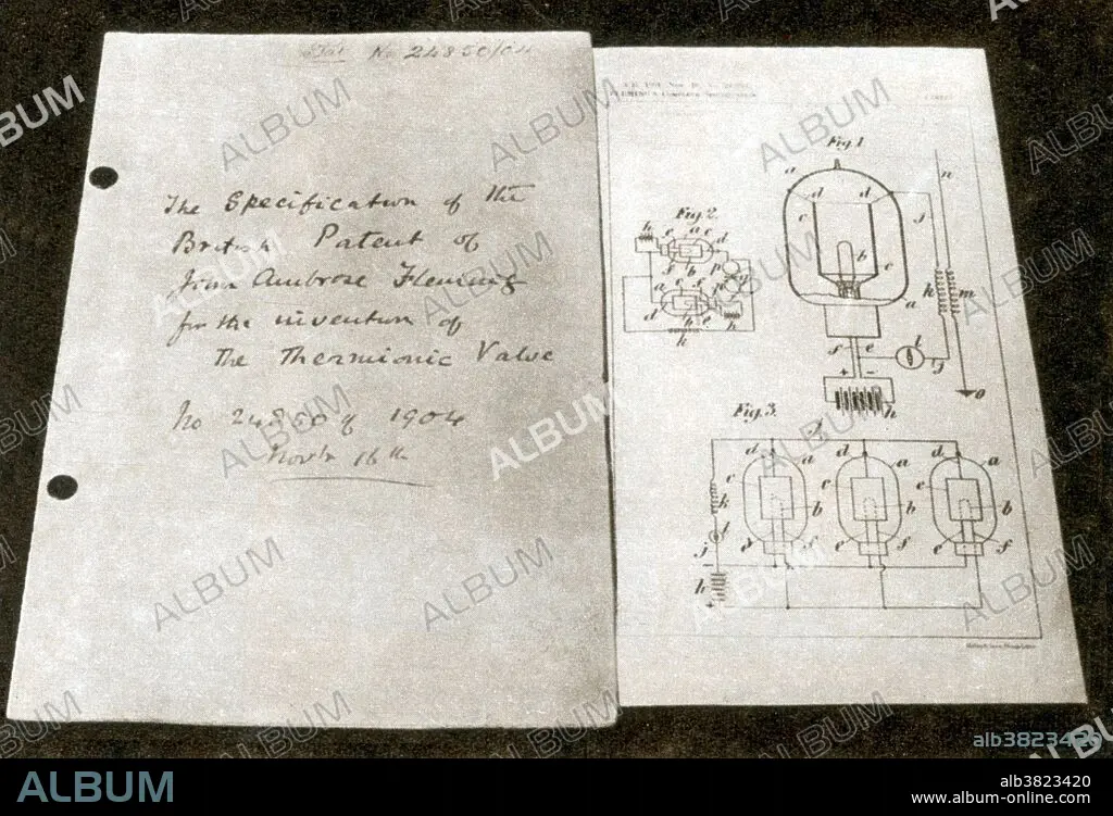 Caption: Fleming's original thermionic valve patent specification of 1904. John Ambrose Fleming (November 29, 1849 - April 18, 1945) was an English electrical engineer and physicist. In 1904, he invented the two-electrode vacuum-tube rectifier, which he called the oscillation valve. It was also called a thermionic valve, vacuum diode, kenotron, thermionic tube, or Fleming valve. This invention is often considered to have been the beginning of electronics, for this was the first vacuum tube. Fleming's diode was used in radio receivers and radars for many decades afterwards, until it was superseded by solid state electronic technology more than 50 years later.