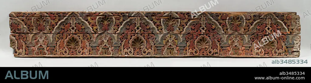 Panel with Cusped Arches, 14th century, From Morocco, Wood (cedar); carved and painted, H. 19 in. (48.3 cm), Wood, Marinid architecture shared many characteristics with that of Andalusia. In both traditions, carved wooden friezes, usually placed near the ceiling above panels of stucco, constituted an important part of interior decoration