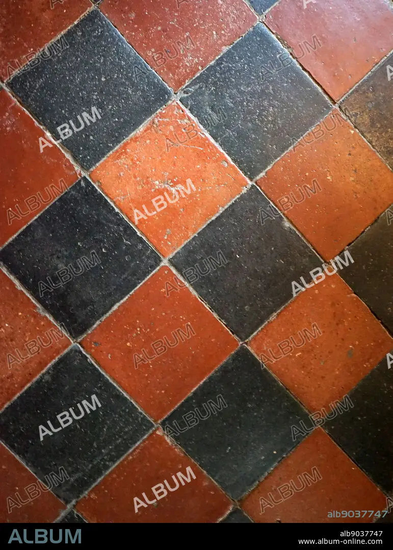 Caption: 17th century Tiles on the floor of a passageway at Baddesley Clinton; a moated manor house, located just north of the historic town of Warwick in the English county of Warwickshire; the house was probably established during the 13th century