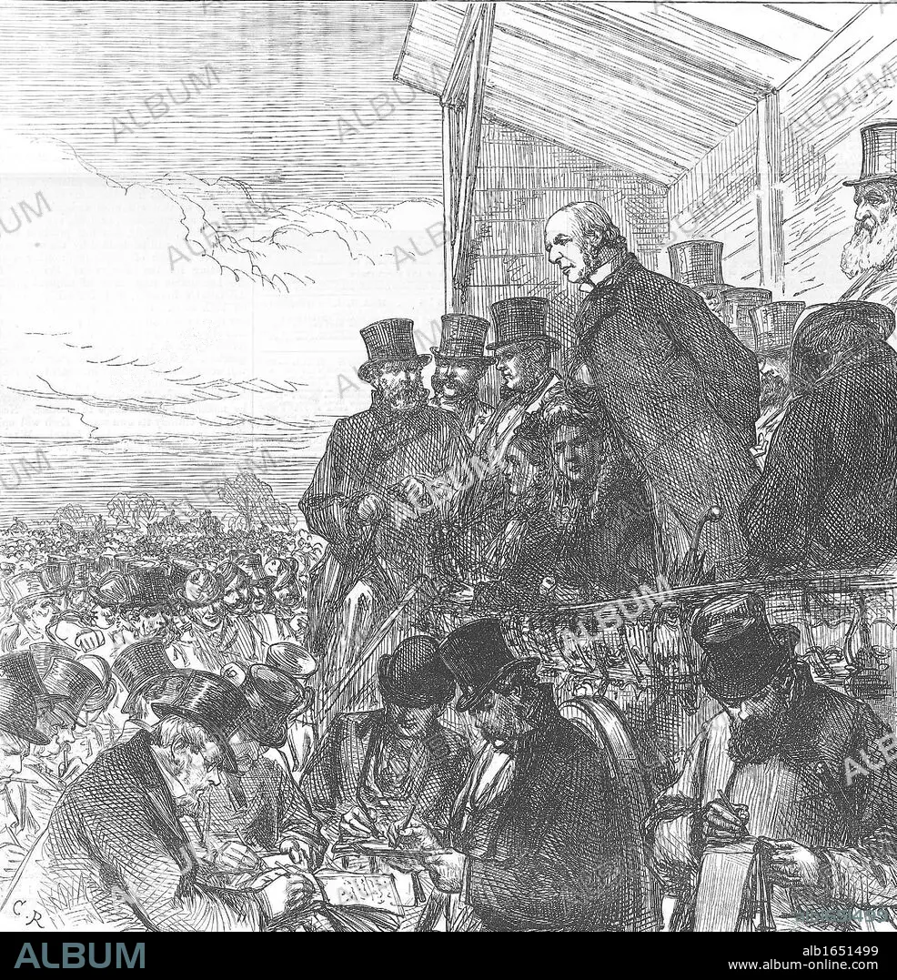 William Ewart Gladstone (1809-1898) giving an election address on Blackheath in his Greenwich constituency. General election February 1874. Gladstone lost to the Conservatives under Disraeli. From The Illustrated London News 7 February 1874.