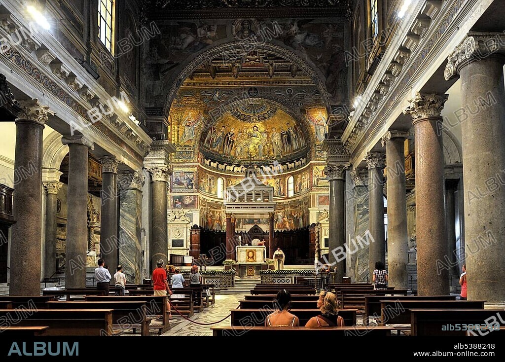 Caption: Nave with antique Ionic columns, triumphal arch, altar with marble ciborium or canopy and apse during mass, Basilica Santa Maria in Trastevere, Rome, Lazio, Italy, Europe