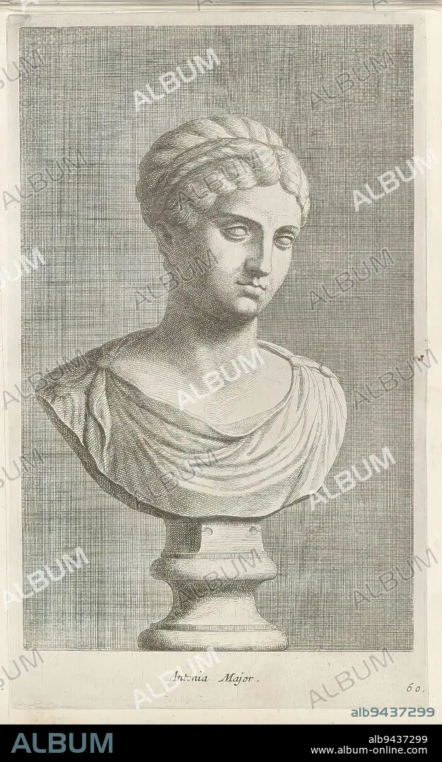 Bust of Antonia the Elder, Antonia Major (title on object), Classical bust of a woman in tunica and with her hair raised. The print is part of an album with a series of prints after sculptures in the collection of Gerard Reynst., print maker: Hubert Quellinus, print maker: Gerard de Lairesse, (rejected attribution), Antwerp, 1646 - 1670, paper, engraving, height 327 mm × width 199 mm