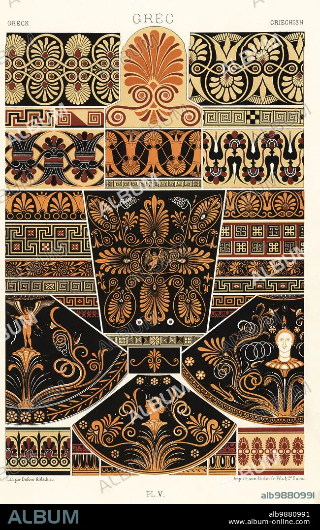 Caption: Ancient Greek art. Painted antifixae from the Temple of Jupiter, Aegina 1, terracotta ornaments from Athens 2-4, paintings on vases 5-12, ova of ogee 13-16, paintings from Apuleian vases 17-20, and fretwork or meanders 21-30.. Hand-finished chromolithograph by Dufour & Mathieu from Albert-Charles-Auguste Racinets LOrnement Polychrome, (Polychromatic Ornament), Firmin-Didot, Paris, 1869-73.