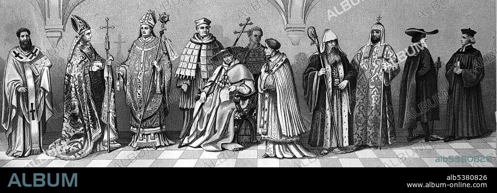 Caption: Cultural history of religion, from left: priest of old Byzantium, bishop in a pluvial, bishop in vestment, provost, cardinal deacon, diocesan priest, Armenian bishop, the Russian Patriarch Nikon, Italian Abbate, a Protestant minister, historical illustration