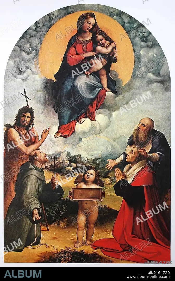Caption: Madonna di Foligno, by Raffaello Sanzio da Urbino, also Raffael da Urbino, Raffaello Santi, Raffaello Sanzio, Raphael, Italian painter, Italy, digitally restored reproduction of a work of art (public domain) from c. 1500, Europe