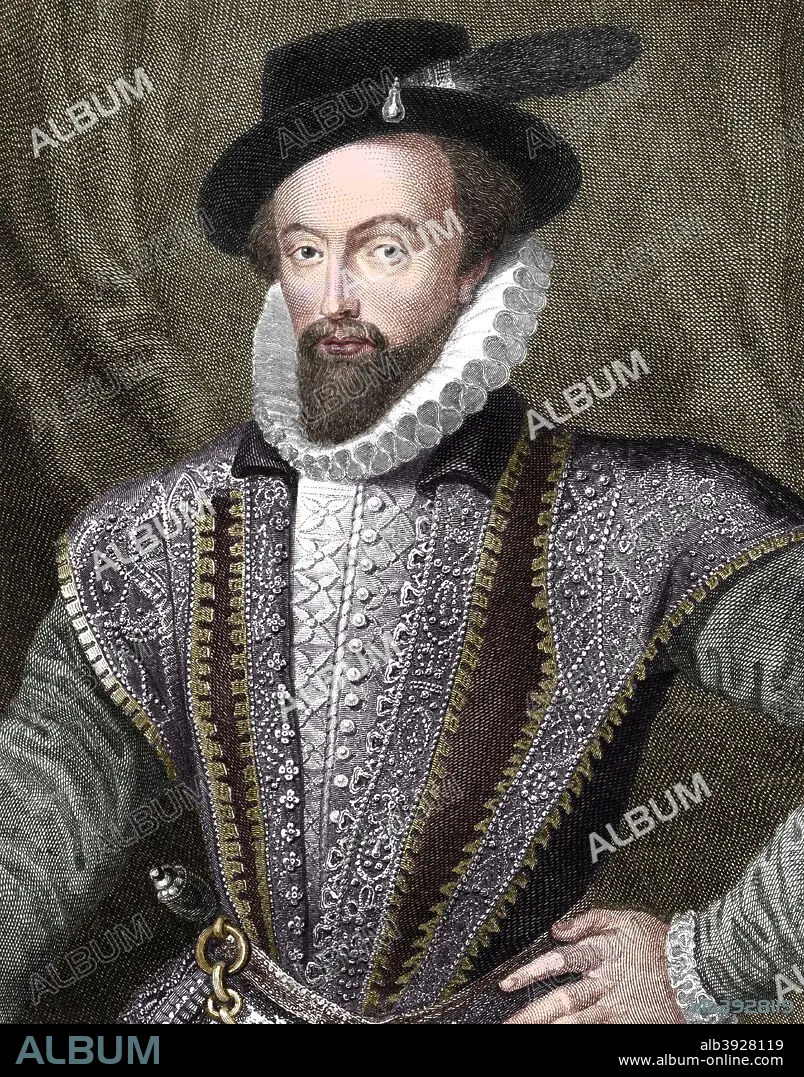 Caption: Sir Walter Raleigh, English writer, poet, courtier, adventurer and explorer, (1821). Raleigh (1554-1618) was a favourite of Queen Elizabeth I, who knighted him in 1585. In 1584-1589 he was involved in an unsuccessful attempt to establish a colony in North America, but did introduce tobacco and the potato to Britain from the New World. Accused of treason by Elizabeth's successor, James I, he was imprisoned in the Tower of London and eventually put to death in 1618. (Colorised black and white print).