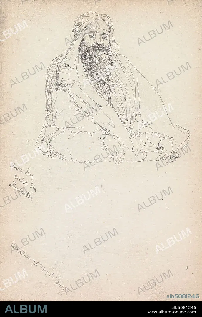 Caption: Dava Singh, Amritsar, 26 March 1860, William Simpson, 18231899, British, 1860, Graphite on medium, smooth, cream wove paper, Sheet: 4 × 5 7/8 inches (10.2 × 14.9 cm) and Binding: 4 1/4 inches (10.8 cm), animal art, camel (mammal), carriage, figure study, genre subject, horse (animal), portrait, Amritsar, India