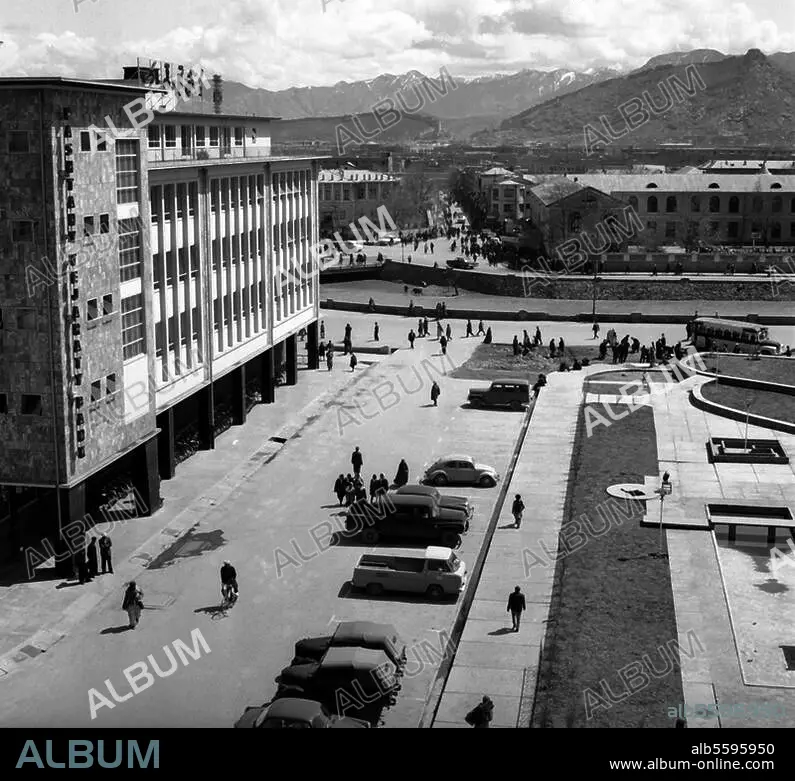 Caption: Kabul (Afghanistan), Fashtany Tejaraty Bank. Square with building of the Fashtany Tejaraty Bank, Kabul River and the old town behind. Photo, undat. From a series "Kaboul", 1963-1971.