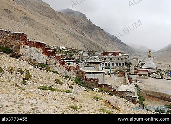 Rongbuk monastery and white stupa in front of the cloudy Mt. Everest, Tibet, China, Asia.