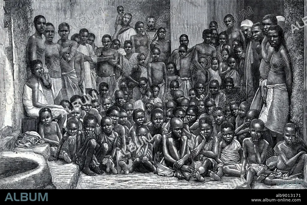 Caption: The African slave-trade. Slaves taken from a dhow captured by H.M.S. Undine, 1884. Print shows African men, women and many children. In the background are two British sailors