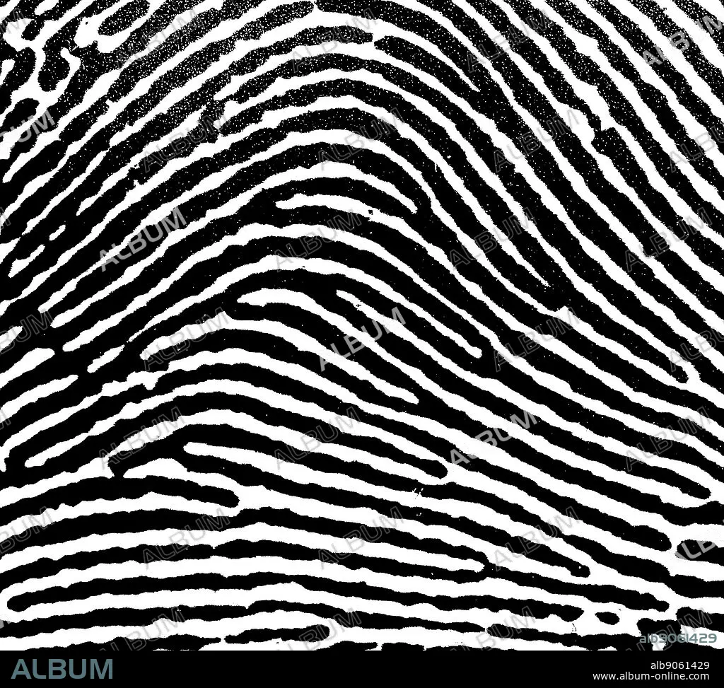 Caption: A Loop fingerprint. Fingerprints are an impression left by the friction ridges of a human finger. The recovery of fingerprints from a crime scene is an important method of forensic science.