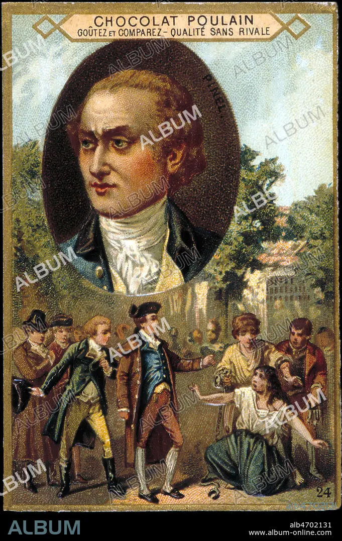 Philippe PINEL (1745-1828) enleve les fers des femmes de l'Hospice de La Salpetriere en 1795. Illustration anonyme pour un chromo publicitaire Poulain vers 1910. Credit : Coll. Jonas/KHARBINE-TAPABOR.