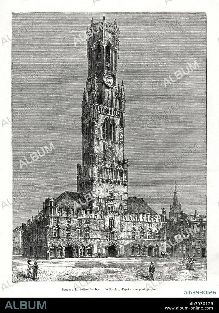 The belfry, Bruges, Belgium, 1886. The mediaeval belfry tower was built between the 13th-15th centuries. Over 80 metres high, it houses a carillon of bells.