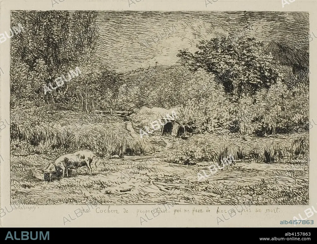 Caption: Pig in an Orchard. Charles François Daubigny; French, 1817-1878. Date: 1855-1865. Dimensions: 103 × 158 mm (image); 120 × 169 mm (plate); 264 × 395 mm (sheet). Etching on cream laid paper. Origin: France.