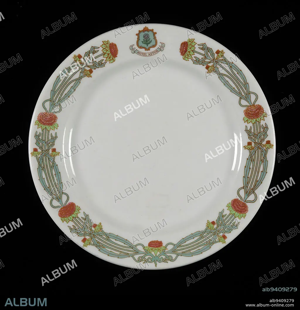 Plate from the Hotel Astor, New York City, c. 1905, Buffalo China Co., Buffalo New York, est. 1901, 15/16 x 7 13/16 x 7 13/16 in. (2.38 x 19.84 x 19.84 cm), Earthenware, United States, 20th century, The heavier weight, customized crest, floral rim, and undecorated center of this plate are typical of restaurant services made in upstate New York. Hotel Astor stood between 44th and 45th Streets on Broadway in New York City, advertised as 'Ten Stories of the Latest Luxury.' A 1905 illustration in the New York Times celebrated the hotel's advanced kitchens, well-appointed dining rooms, and wine Vaults. At least one later version of this sunflower motif was designed for the hotel before it was demolished in 1967.