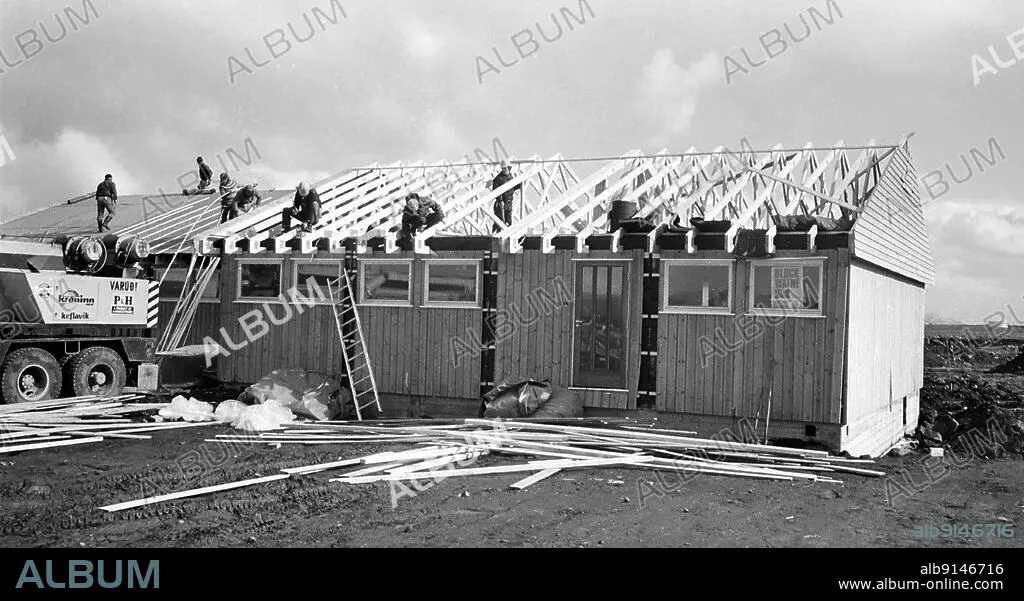 Caption: Vestmannaeyjar, Iceland May 1973. Aid measures after the natural disaster. Norwegian ready -made houses are raised in Iceland, to help the population of Vestmannaeyjar who had to be evacuated during the volcanic quarry. Here is a Block Watne house. Photo: Håvard Narum, NTB / NTB (L.5553)