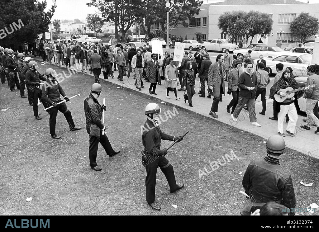 San Francisco, California: January 7, 1969 Riot police establish a line during the San Francisco State University student strike demonstration and subsequent riots.