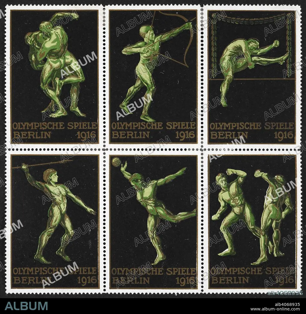Caption: Various figures representing wrestling, archery, the high jump, javelin and the shot put. Germany 1916 Berlin Olympic Games poster stamp block of six, unused . (The Campbell Johnston Collection). 1916. Language: German.